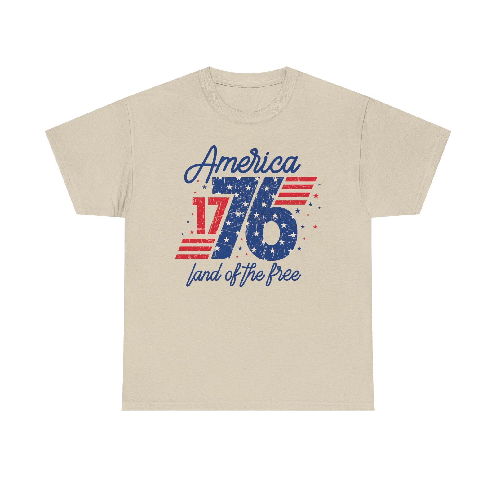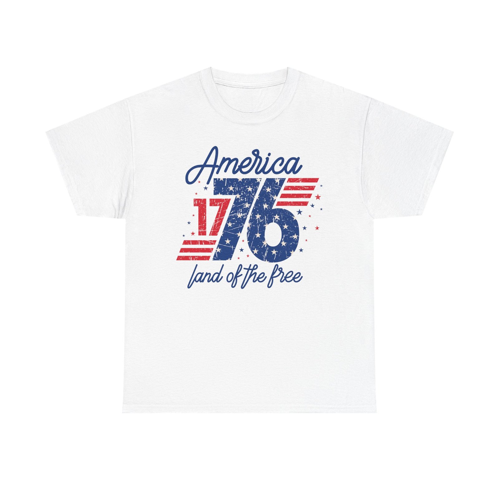 A crisp, vintage-inspired tee that carries a quiet pride — a soft white shirt printed with distressed red and blue graphics reading “America 1776” and “land of the free.” It sits with a classic crew neckline and a relaxed, classic fit that layers easily under a denim jacket or stands on its own at a backyard barbecue. The faded, worn-in print gives a nostalgic, lived-in feel without being loud. Breathable medium-weight cotton keeps it comfortable through summer parades and casual evenings, while the tear-away label and reinforced shoulder tape keep the silhouette clean and comfortable all day. Subtle enough for everyday wear, familiar enough to spark conversation on patriotic occasions and neighborhood gatherings.